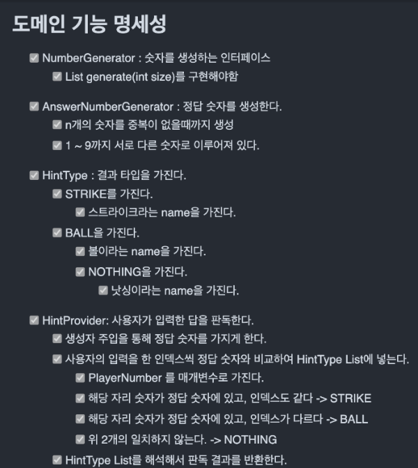 출력되는 “스트라이크”, “볼”, “낫싱” 문구는 도메인 명세로 봐야 하는가?